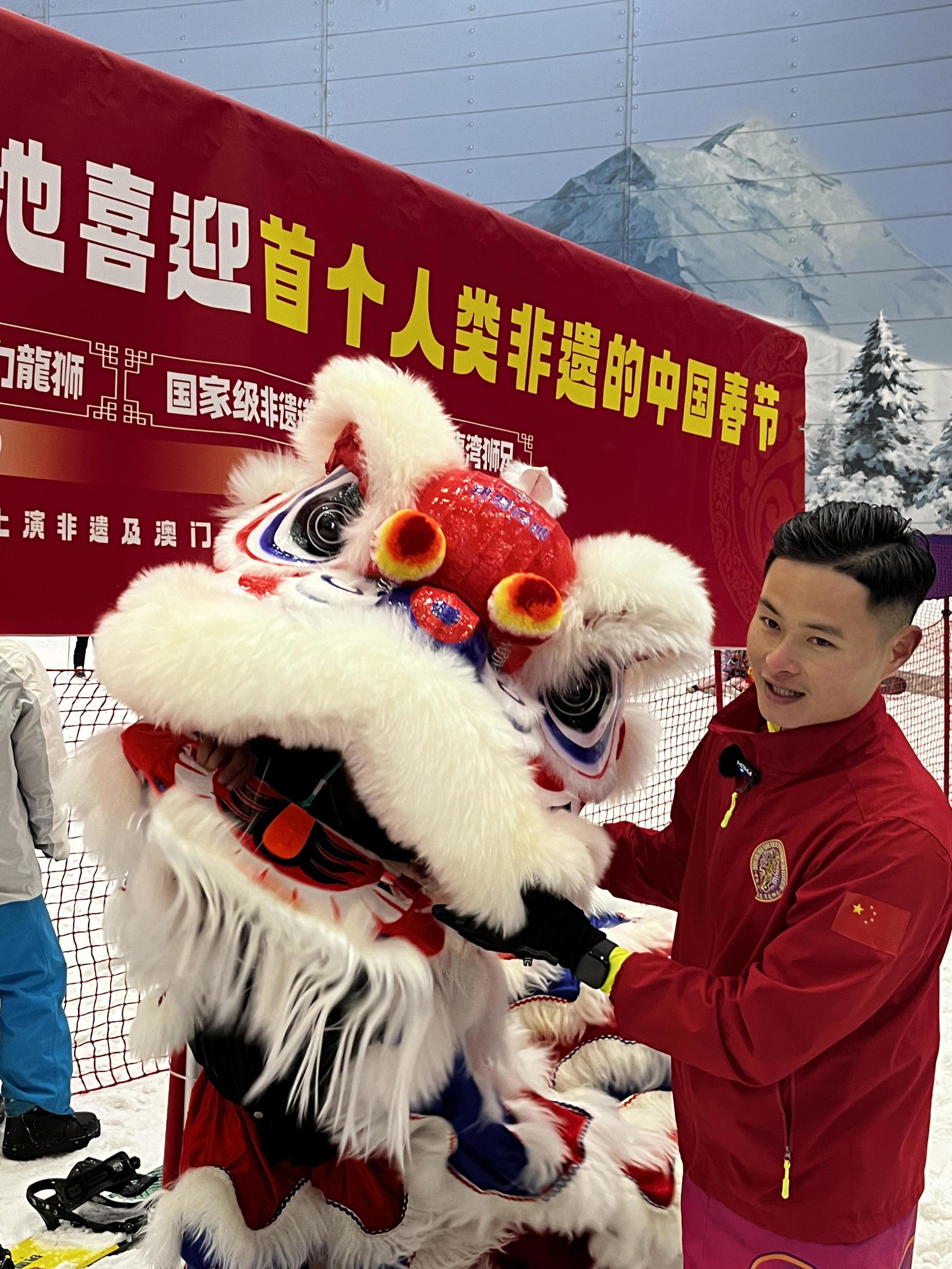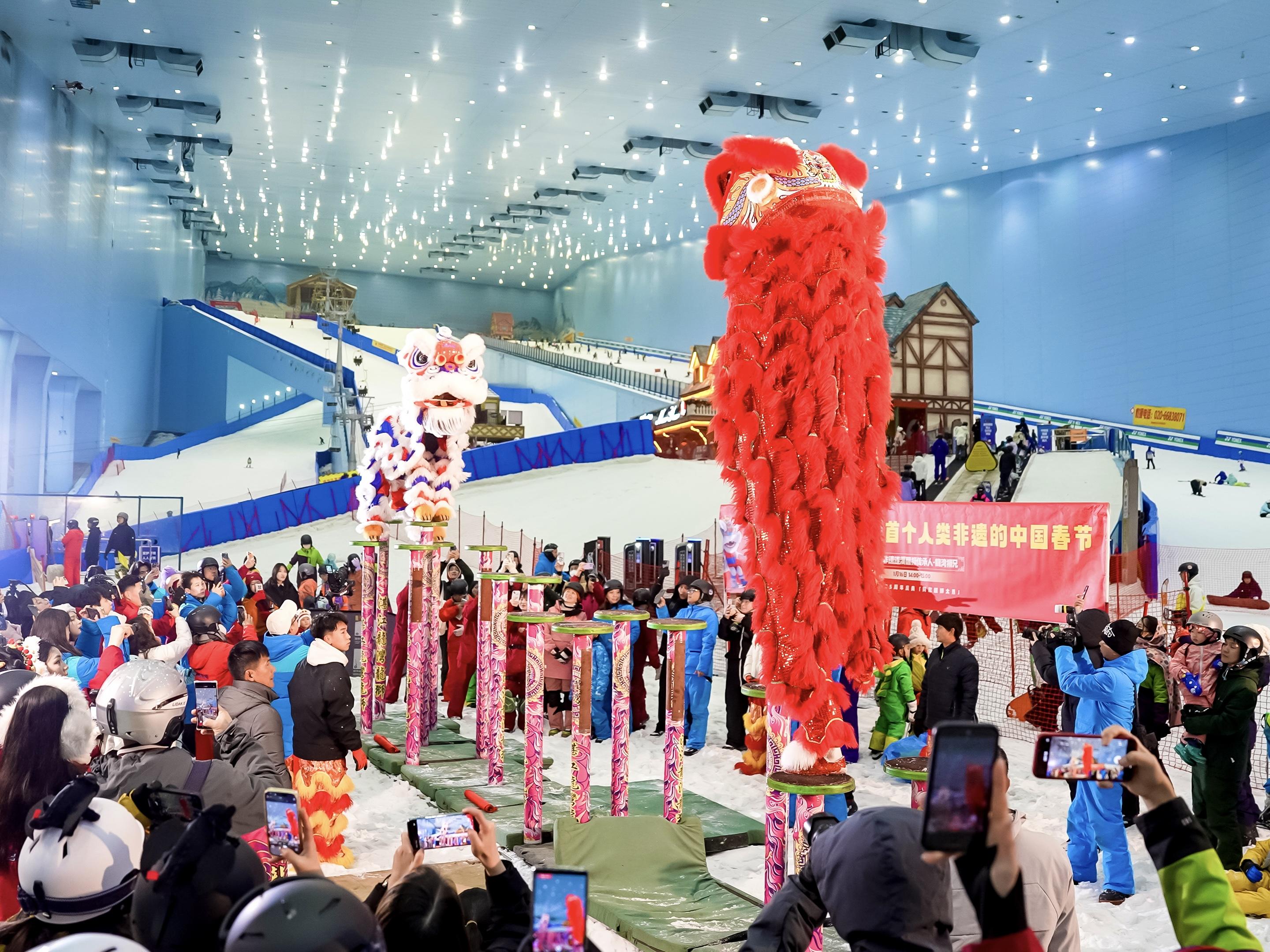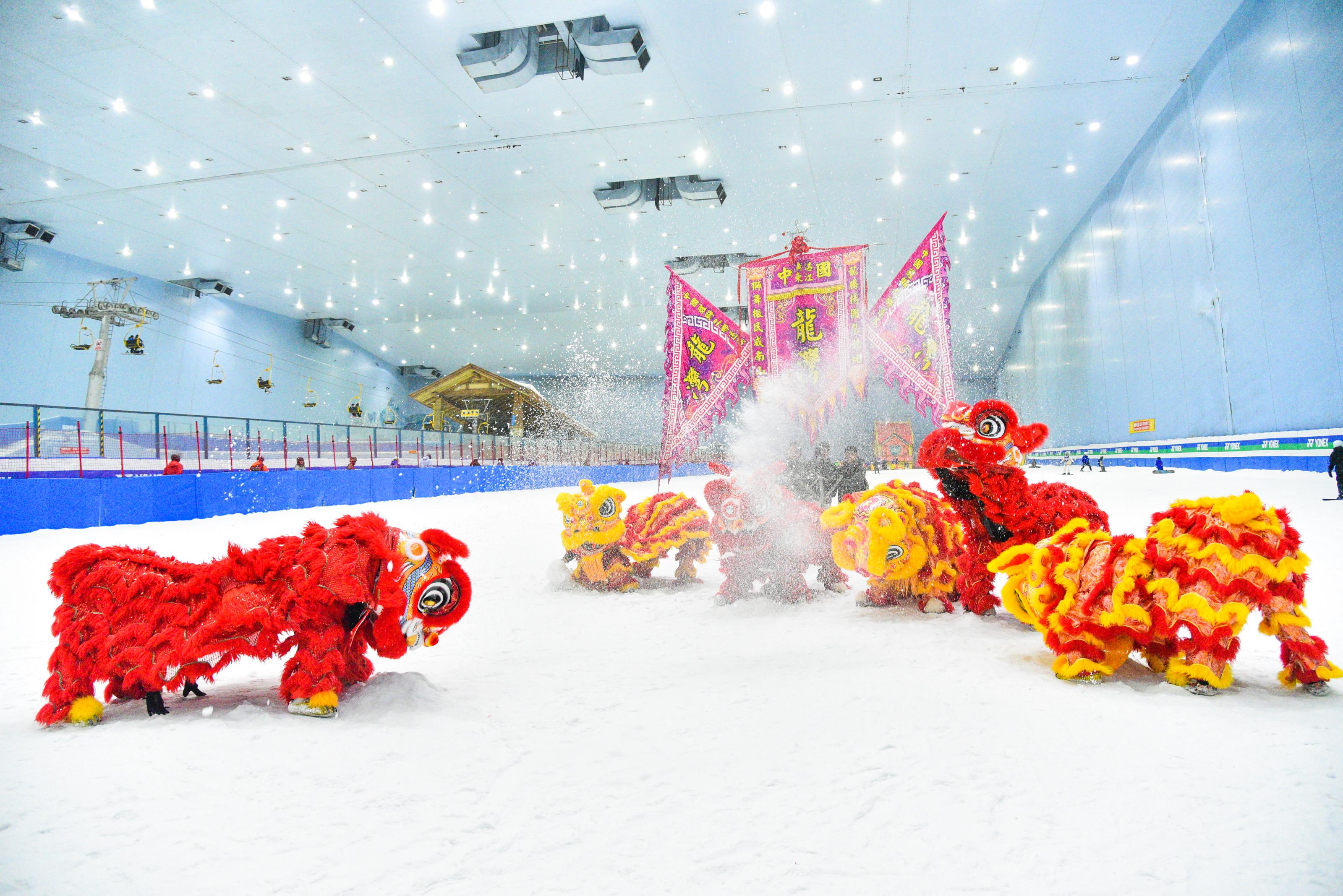 广州热雪奇迹此次特别邀请曾参与澳门回归祖国25周年庆典的国家级非遗遂溪醒狮传承团队,为观众呈现一场精彩绝伦的雪地醒狮表演——多只醒狮在雪地中完成一系列高难度动作,包括踩梅花桩、腾翻、扑跌、跳跃、登高等,现场热闹非凡,引得不少游客争相与醒狮拍照,沾沾喜庆。