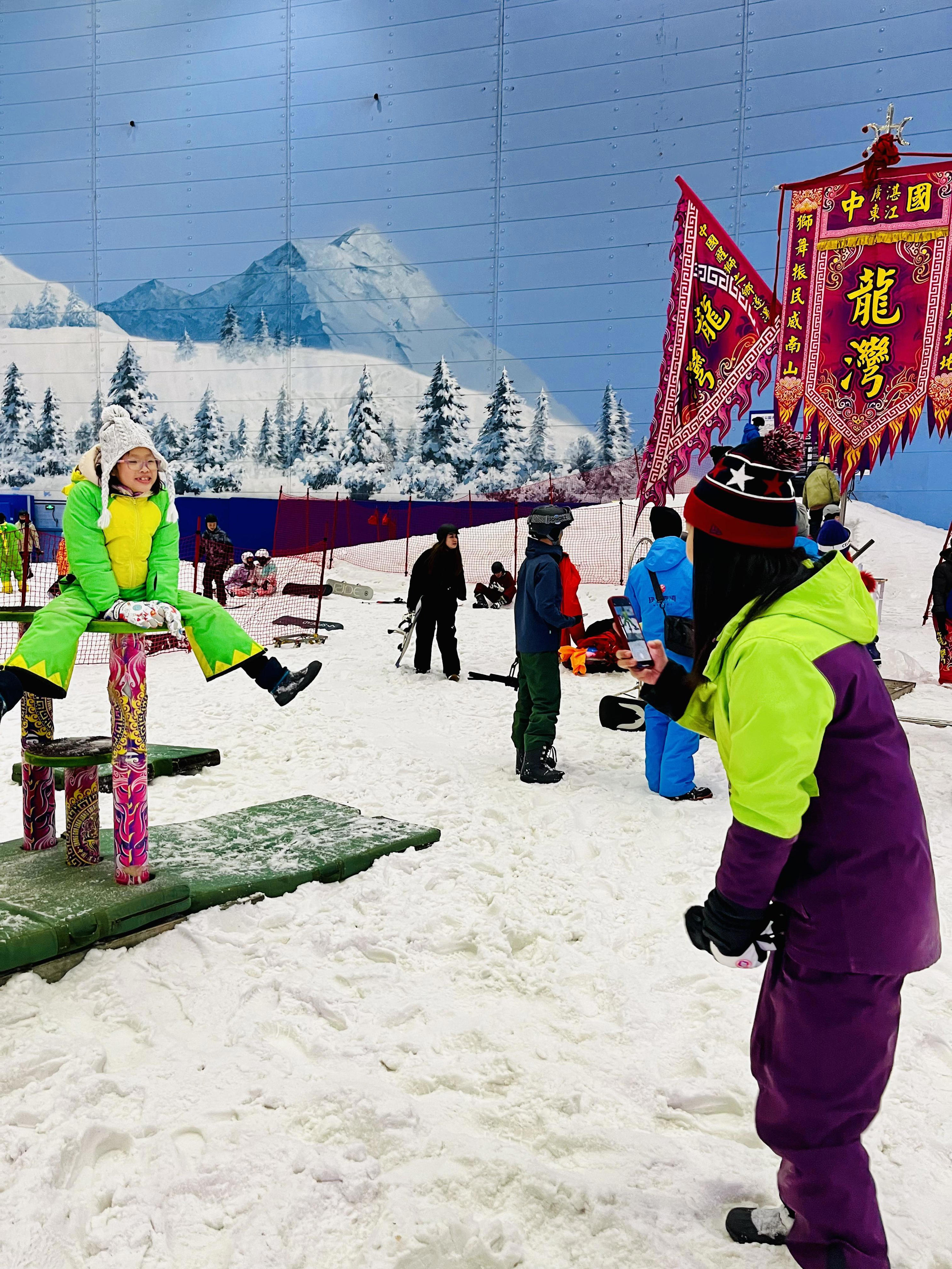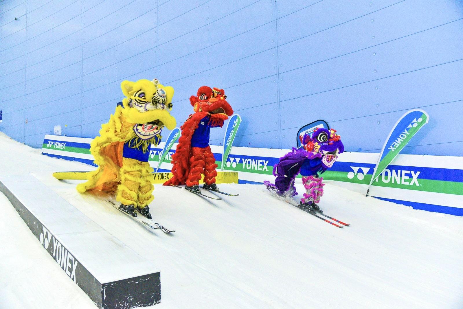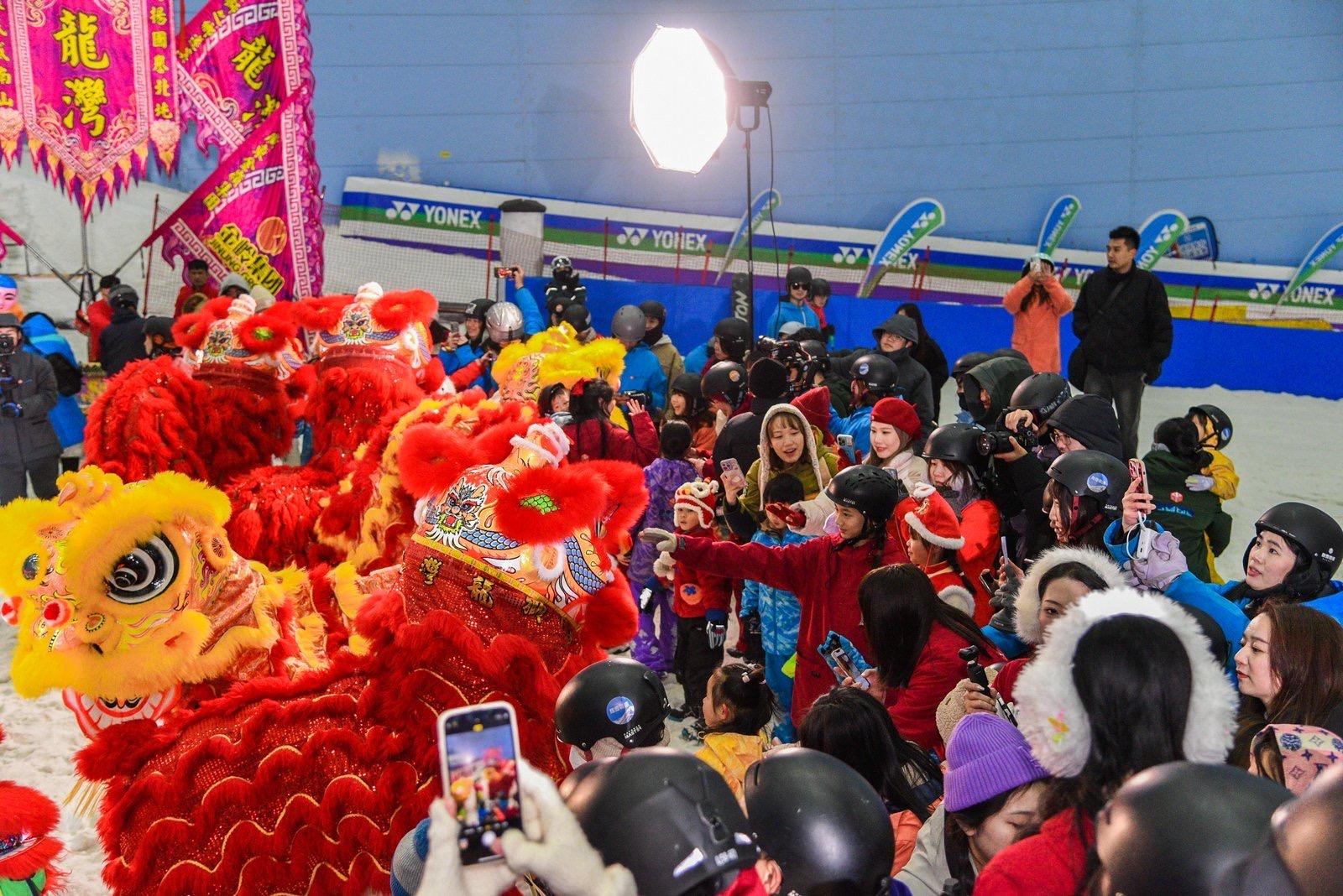 广州热雪奇迹此次特别邀请曾参与澳门回归祖国25周年庆典的国家级非遗遂溪醒狮传承团队,为观众呈现一场精彩绝伦的雪地醒狮表演——多只醒狮在雪地中完成一系列高难度动作,包括踩梅花桩、腾翻、扑跌、跳跃、登高等,现场热闹非凡,引得不少游客争相与醒狮拍照,沾沾喜庆。